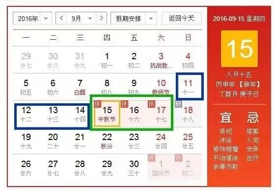 9月15日是中秋节,国家法定假期为15-17日3天。如果请假的话,带上周末就可以连休8天哦。
